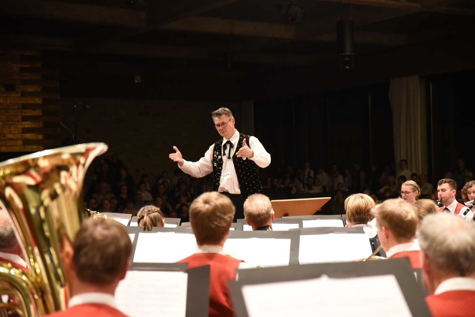 Nach dieser war es dann soweit: Die „große“ Blaskapelle erklomm die Bühne und bekam schon viel Applaus als Vorschlusslorbeeren. Dass dieses vorgezogene Lob nicht unberechtigt war, zeigte auch gleich das erste Stück: Le Régiment de Sambre-et-Meus ist ein Militärmarsch aus dem Jahre 1870 und zeigte bereits das ganze Können der Musikantinnen und Musikanten. Sie präsentierten sich von Anfang an recht dynamisch – kein Wunder, denn bei einer Männer- und Frauenstärke, die etwa vier Fußballmannschaften entspricht, darf man schon einiges erwarten – zumal der Trainer passt: Mit seiner galant-zurückhaltenden, aber dennoch zugleich bestimmten Art des Dirigierens gelang es Markus Beck, dem Gesamtkorpus seiner Truppe an der richtigen Stelle die richtigen Töne in der richtigen Lautstärke zu entlocken. Die Zuhörer dankten es ihm und den Musikern mit großem Applaus. Zu den weiteren Stücken des Abend zählten etwa noch das Musicalstück Les Miserables von Claud Michael Schönberg oder El Cartero von Hans van der Heide. Das Pink Panther Theme von Henry Mancini wurde so authentisch vorgetragen, dass man bei geschlossenen Augen wohl Peter Sellers als Inspector Clouseau vor sich gesehen hätte.